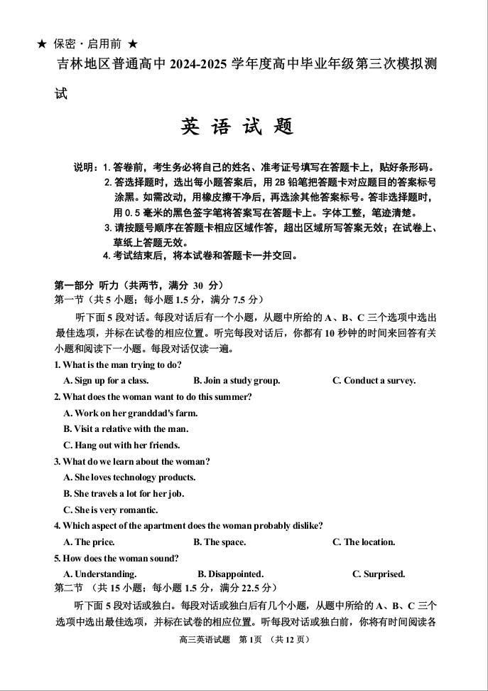 吉林省吉林市普通高中2025届高三第三次模拟测试(吉林三模)英语