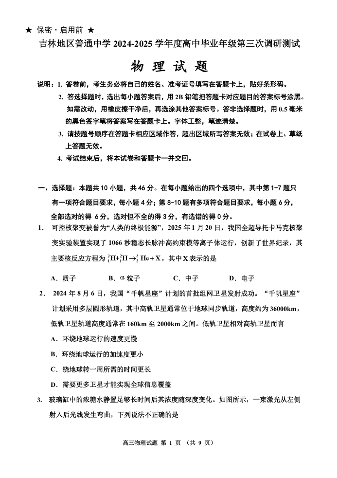 吉林省吉林市普通高中2025届高三第三次模拟测试(吉林三模)物理