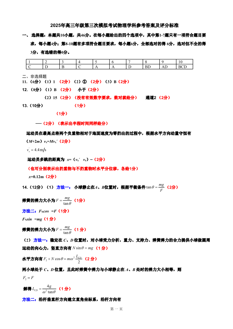 吉林省吉林市普通高中2025届高三第三次模拟测试(吉林三模)物理答案