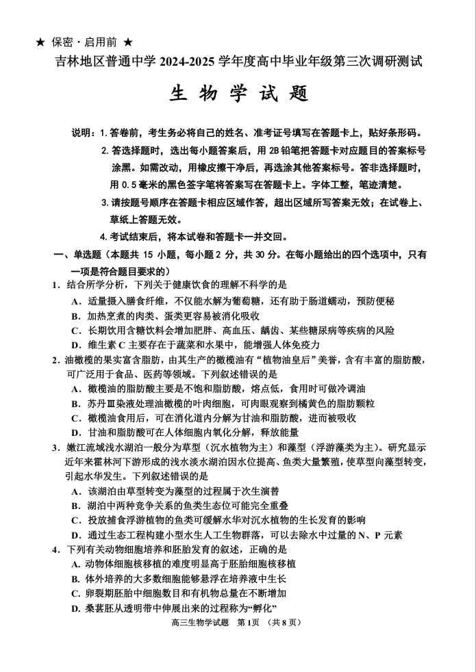 吉林省吉林市普通高中2025届高三第三次模拟测试生物