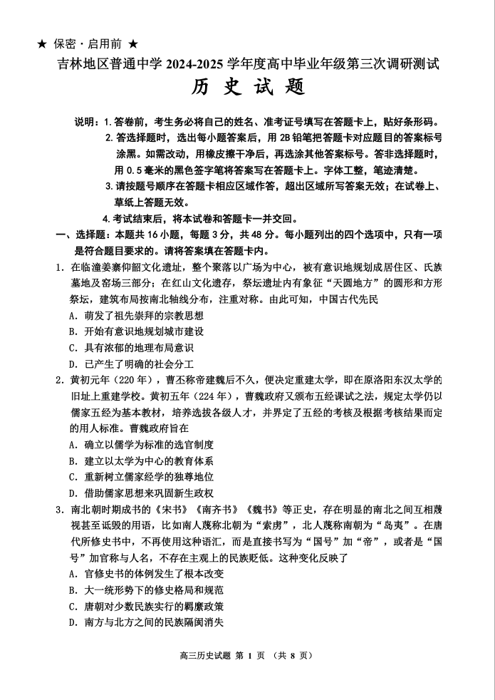 吉林省吉林市普通高中2025届高三第三次模拟测试(吉林三模)历史