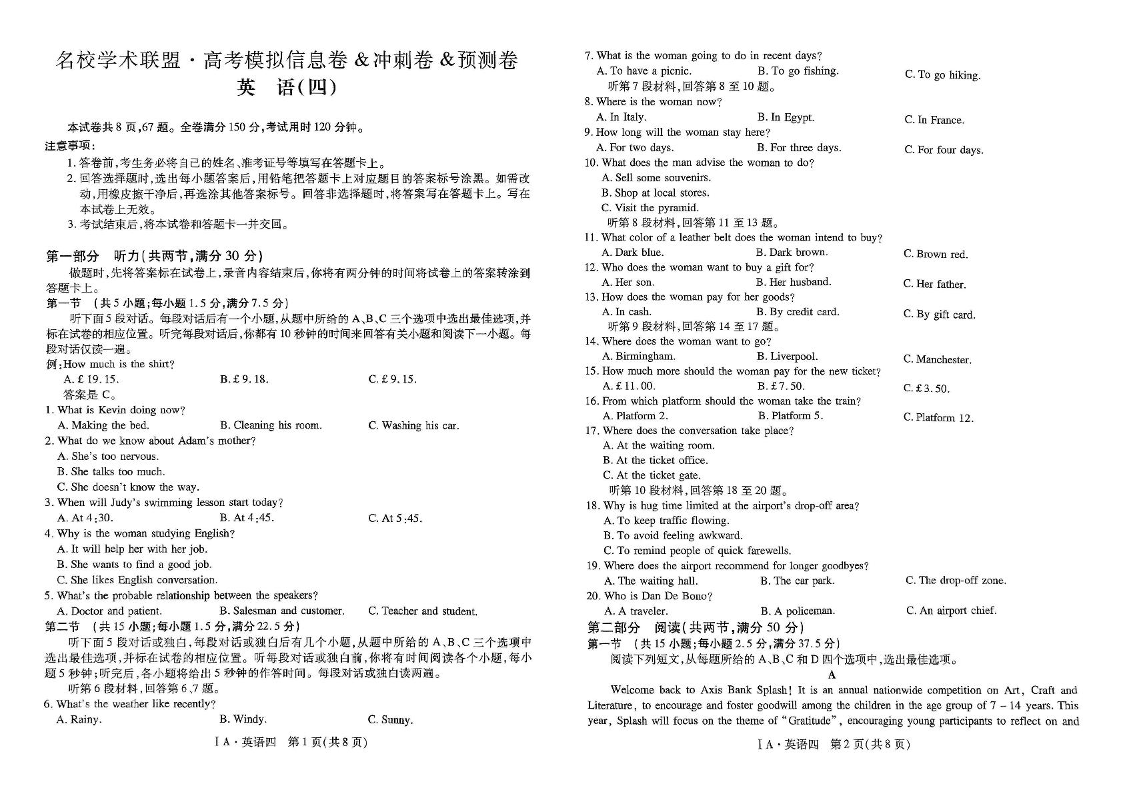 名校学术联盟·高考模拟信息卷&冲刺卷&预测卷(四)英语+答案