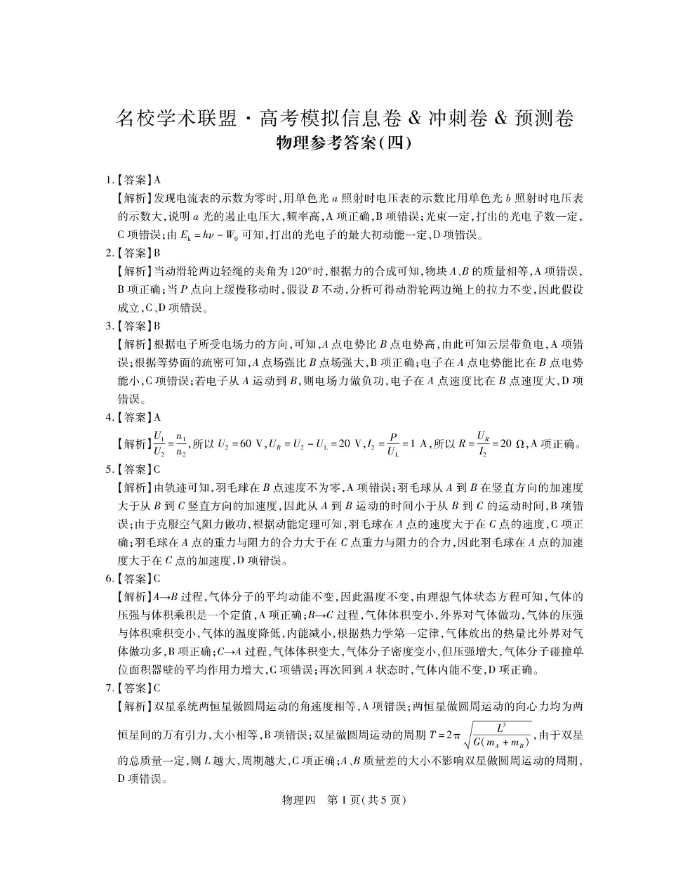 名校学术联盟·高考模拟信息卷&冲刺卷&预测卷(四)物理答案
