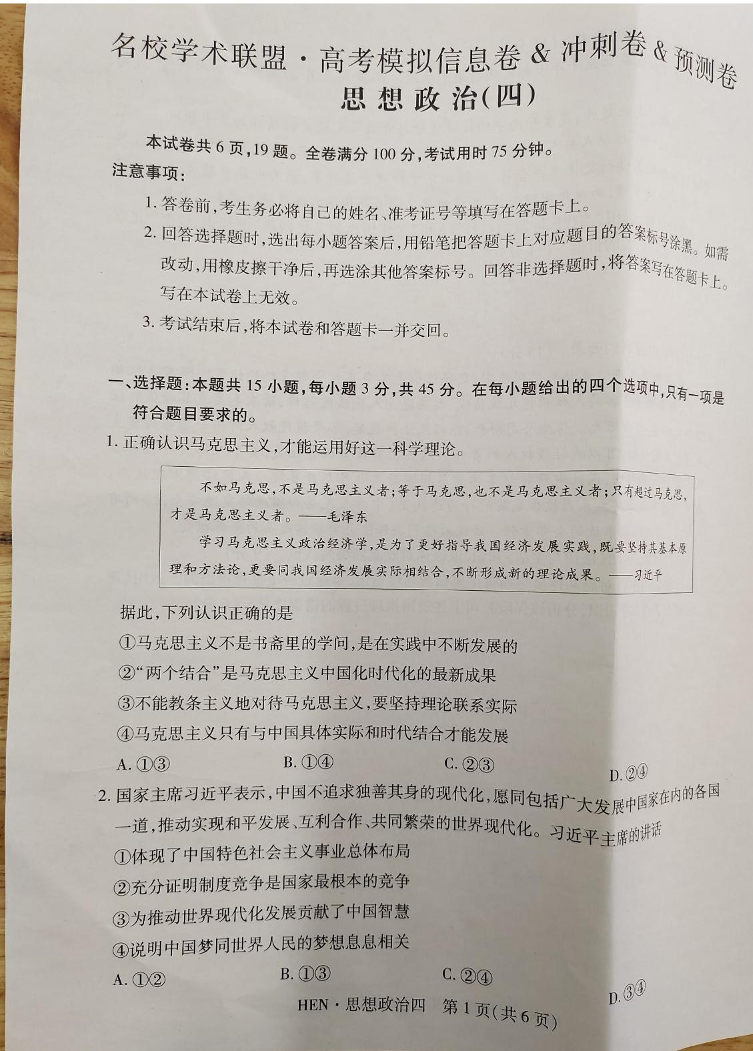 名校学术联盟·高考模拟信息卷&冲刺卷&预测卷(四)政治