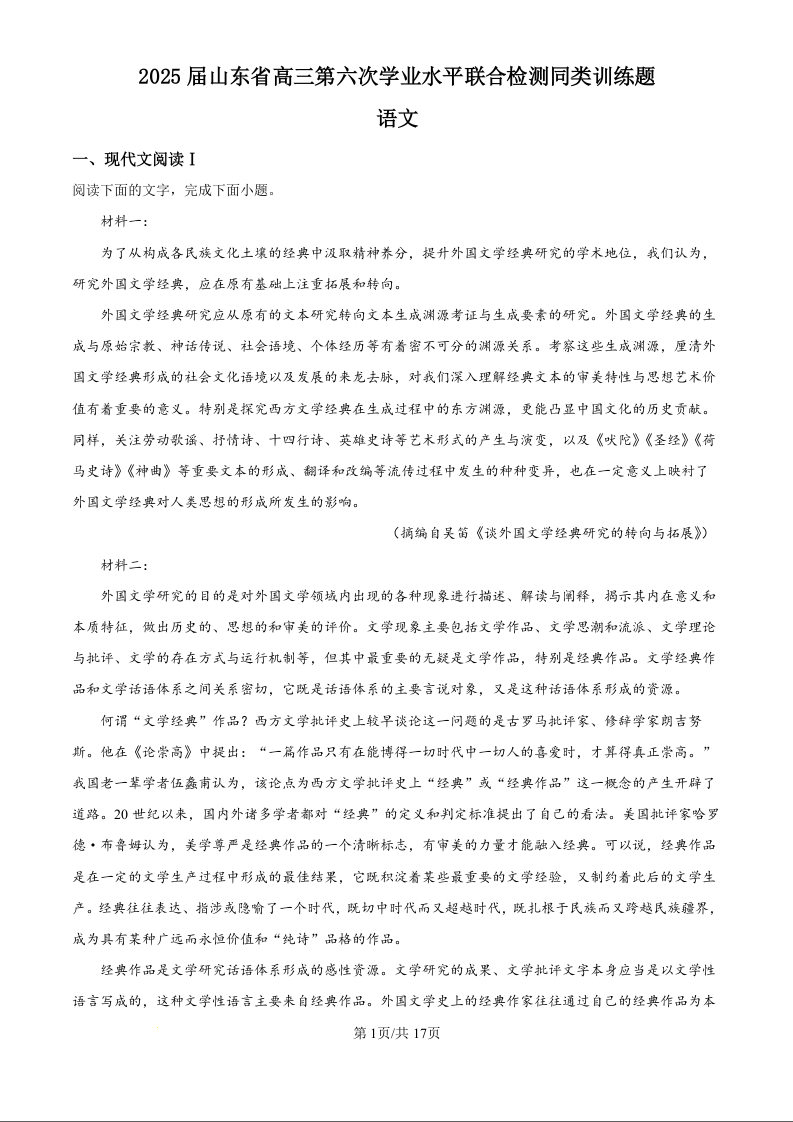 山东省齐鲁名校大联考2025届高三下学期第六次学业水平联合检测语文 (原卷版)