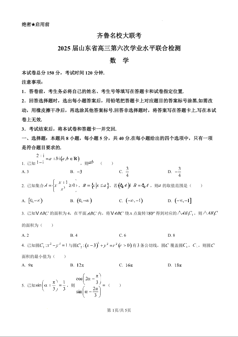 山东省齐鲁名校大联考2025届高三下学期第六次学业水平联合检测数学(原卷版)
