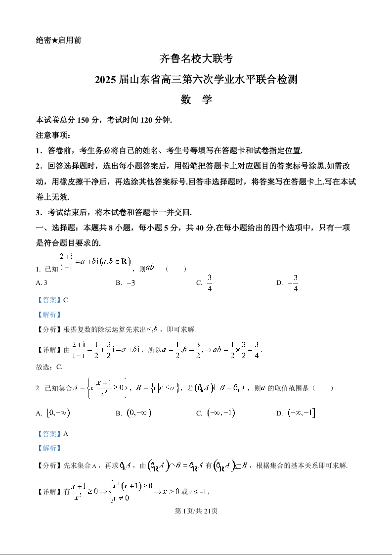 山东省齐鲁名校大联考2025届高三下学期第六次学业水平联合检测数卷(精品解析版)