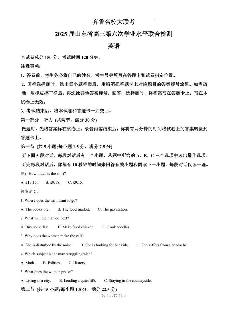 山东省齐鲁名校大联考2025届高三下学期第六次学业水平联合检测英语(原卷版)