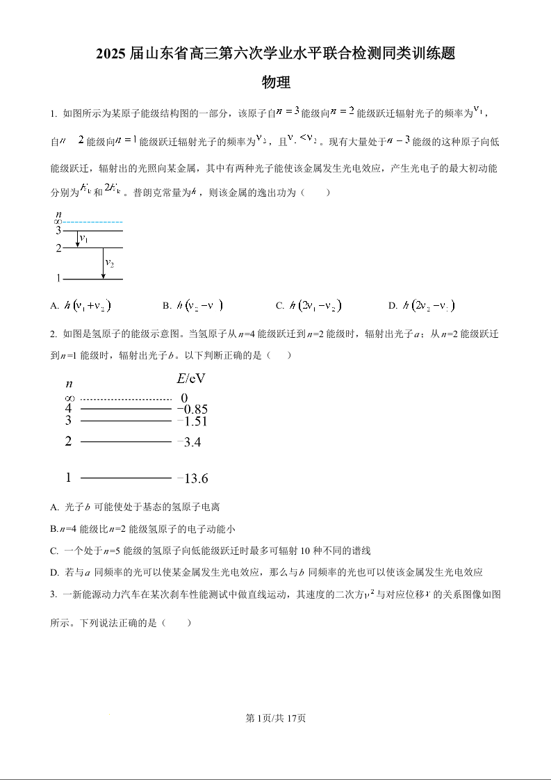山东省齐鲁名校大联考2025届高三下学期第六次学业水平联合检测物理(原卷版)