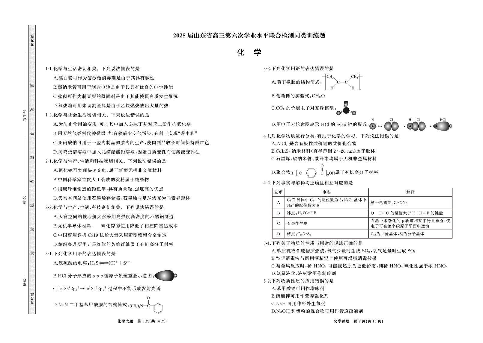 山东省齐鲁名校大联考2025届高三下学期第六次学业水平联合检测化学