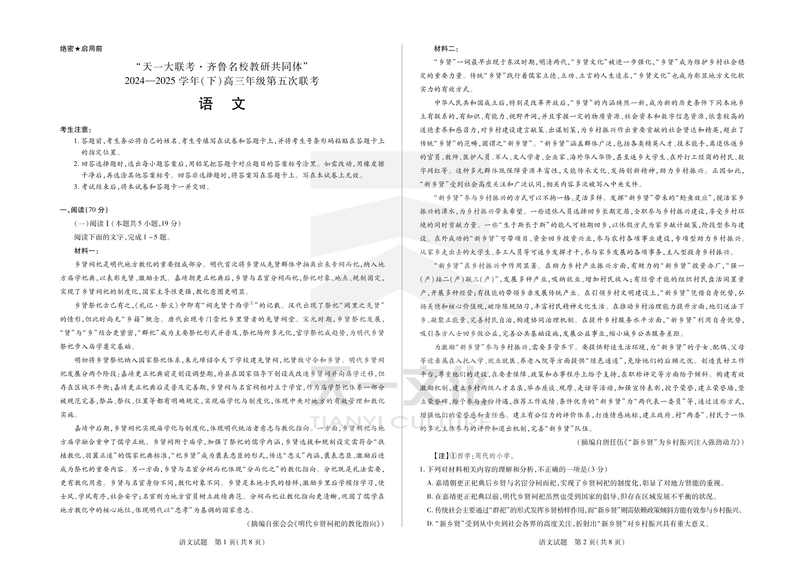 山东省天一大联考齐鲁名校教研共同体2025届高三下学期第五次联考语文