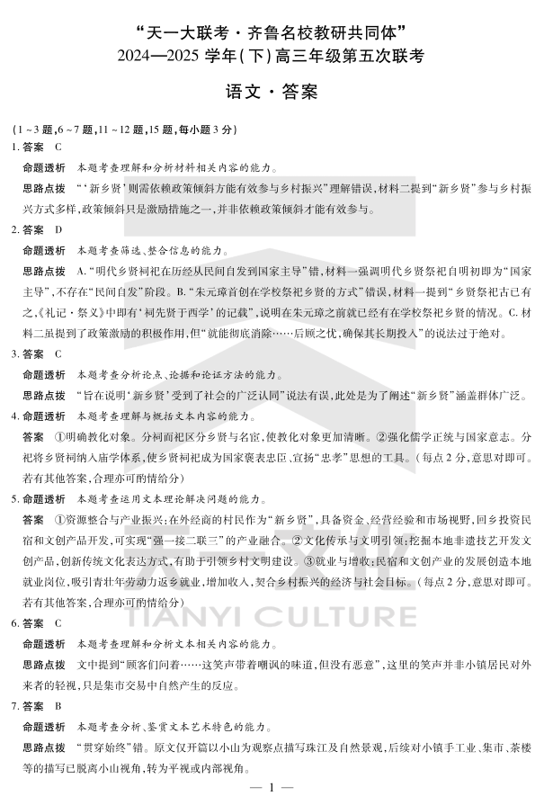 山东省天一大联考齐鲁名校教研共同体2025届高三下学期第五次联考语文答案