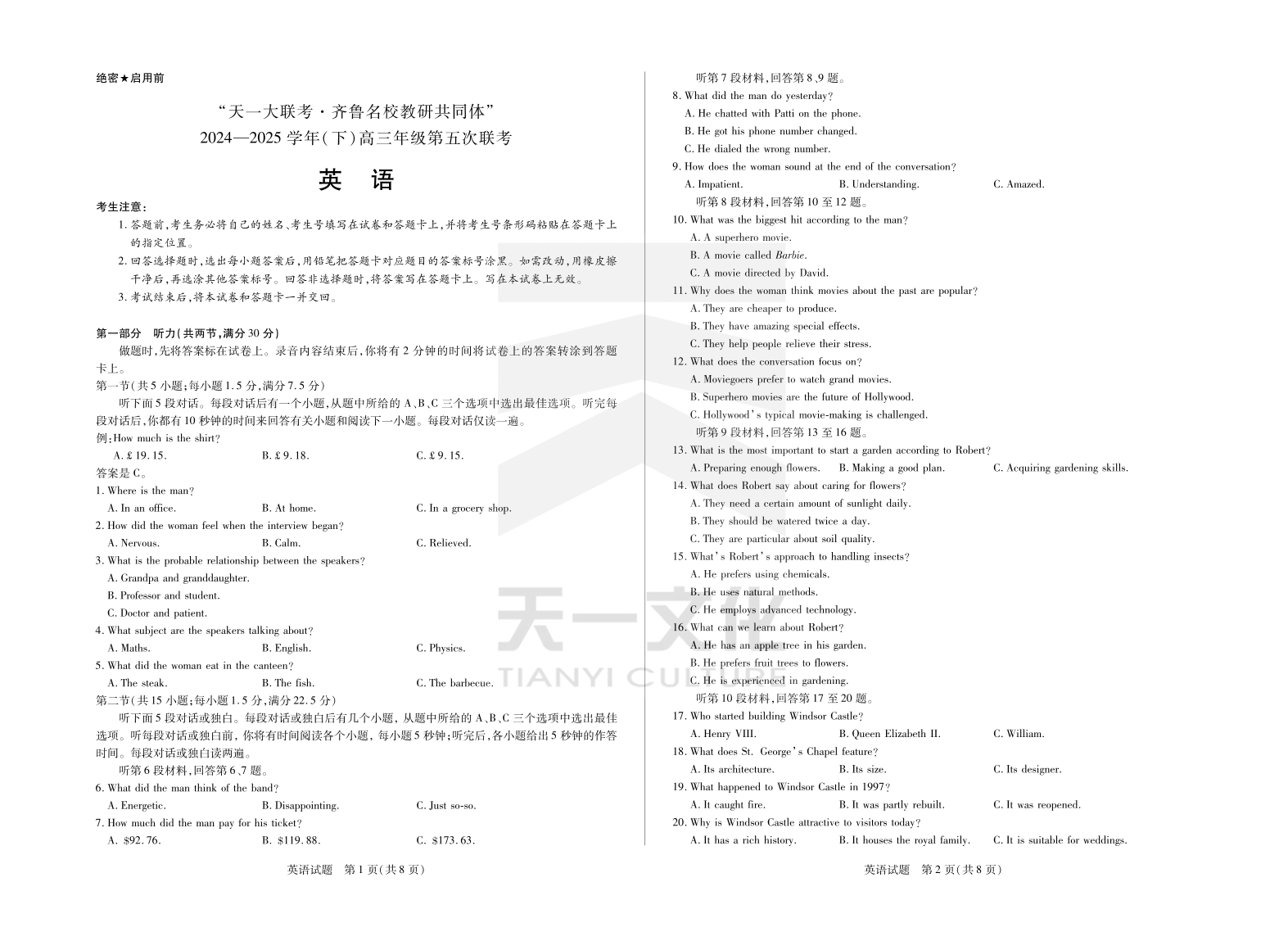 山东省天一大联考齐鲁名校教研共同体2025届高三下学期第五次联考英语