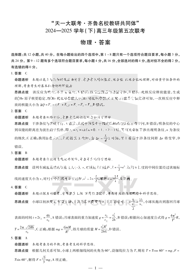 山东省天一大联考齐鲁名校教研共同体2025届高三下学期第五次联考物理答案