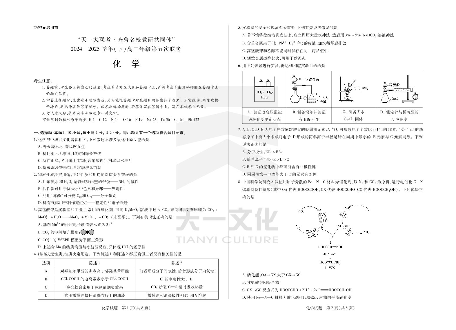 山东省天一大联考齐鲁名校教研共同体2025届高三下学期第五次联考化学