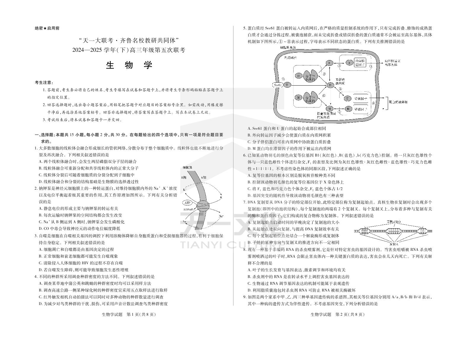 山东省天一大联考齐鲁名校教研共同体2025届高三下学期第五次联考生物