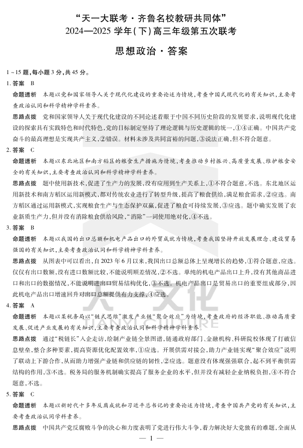 山东省天一大联考齐鲁名校教研共同体2025届高三下学期第五次联考政治答案