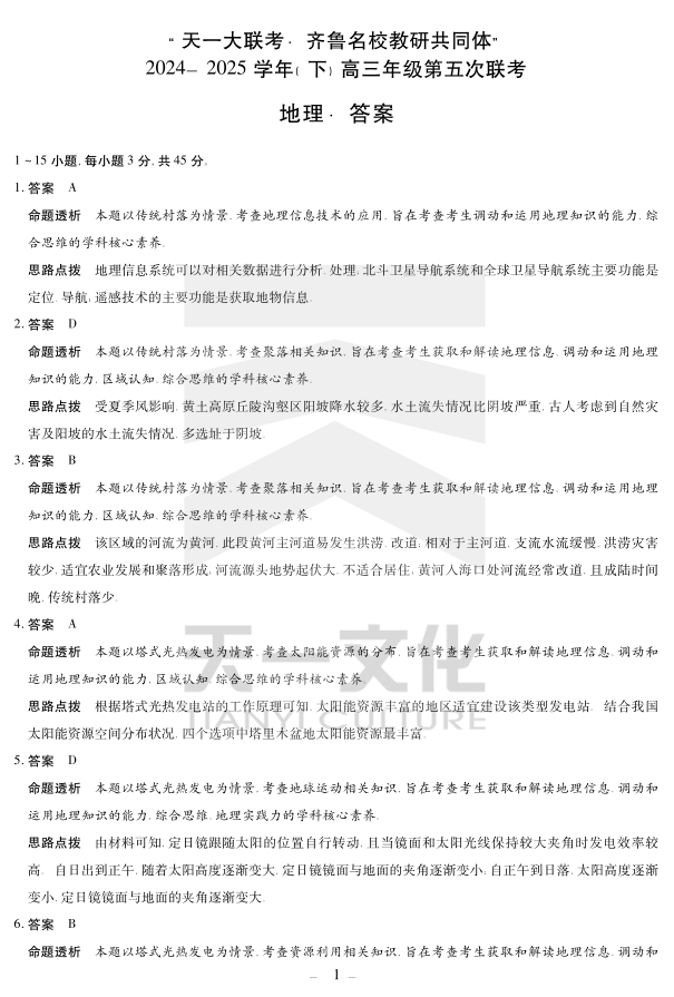 山东省天一大联考齐鲁名校教研共同体2025届高三下学期第五次联考地理答案