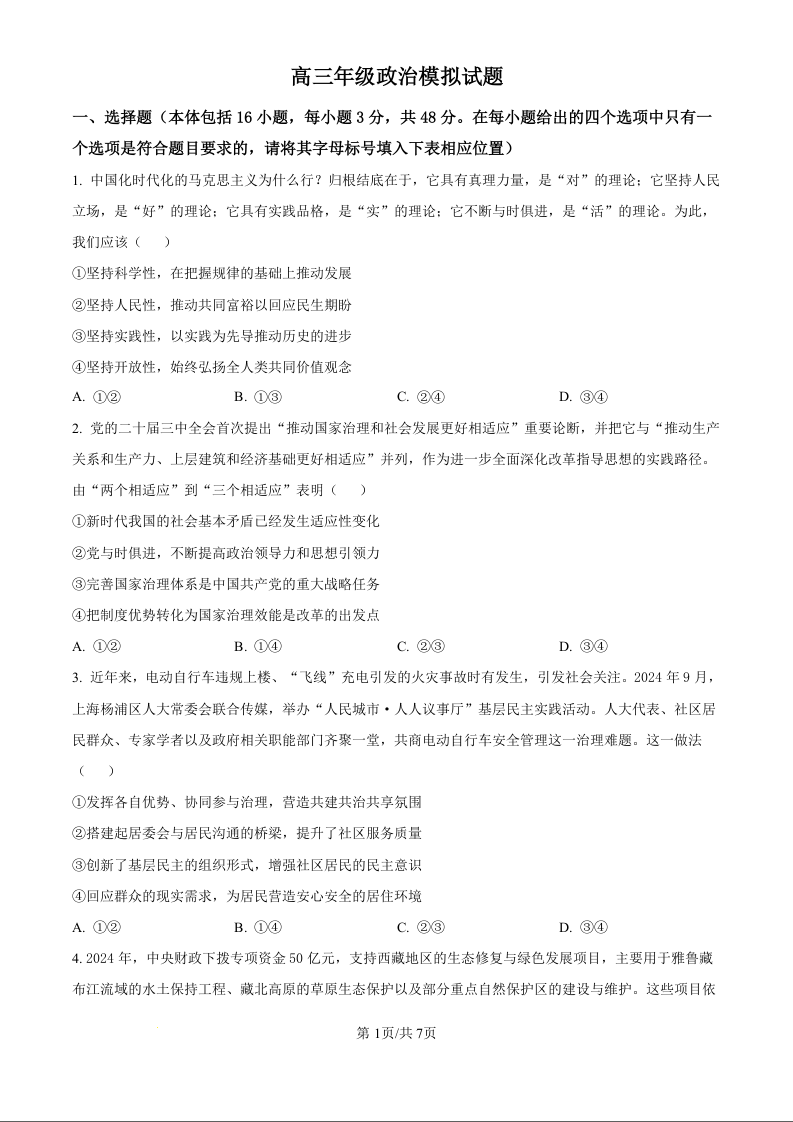 山西省大学附属中学校2024-2025学年高三下学期3月月考政治