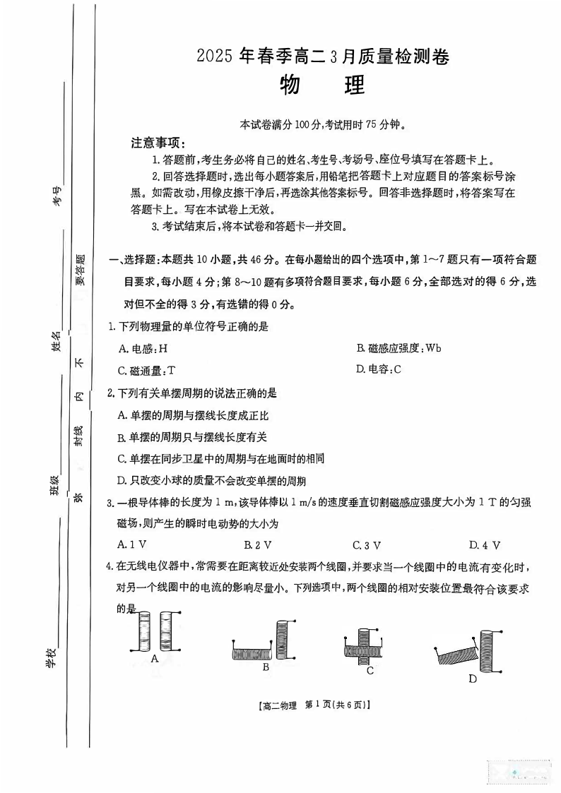 广西壮族自治区“贵百河”联考2024-2025学年下学期3月高二月考物理