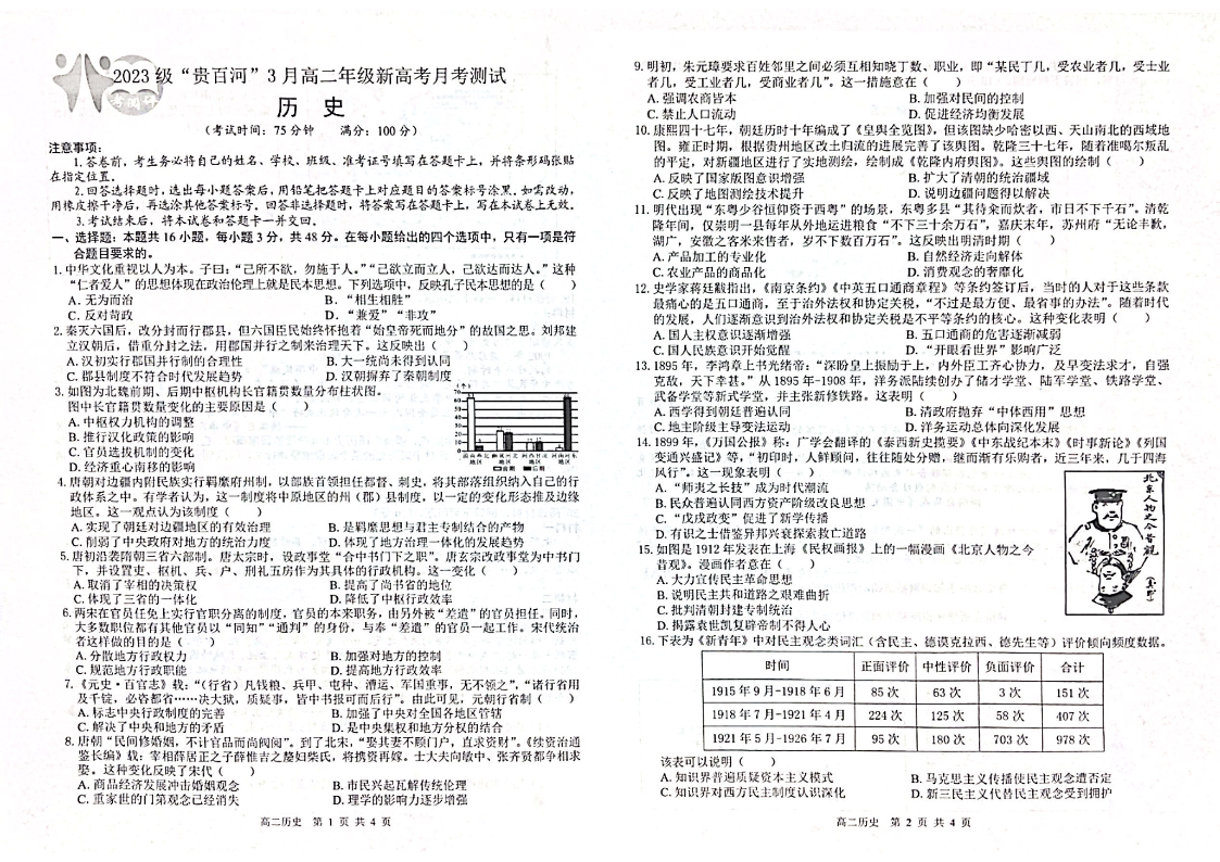 广西壮族自治区“贵百河”联考2024-2025学年下学期3月高二月考历史