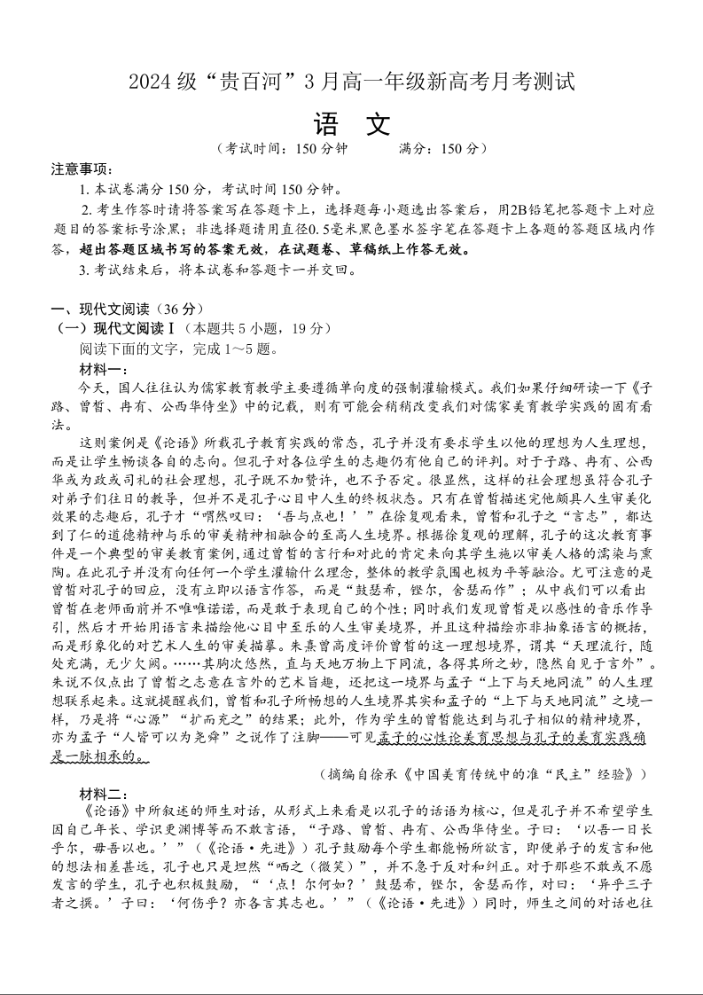 广西壮族自治区“贵百河”联考2024-2025学年下学期3月高一月考语文