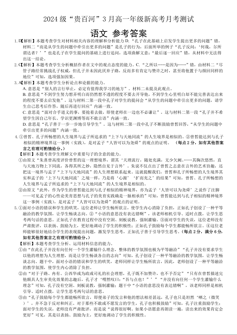 广西壮族自治区“贵百河”联考2024-2025学年下学期3月高一月考语文答案