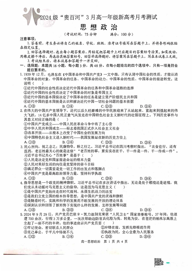 广西壮族自治区“贵百河”联考2024-2025学年下学期3月高一月考政治
