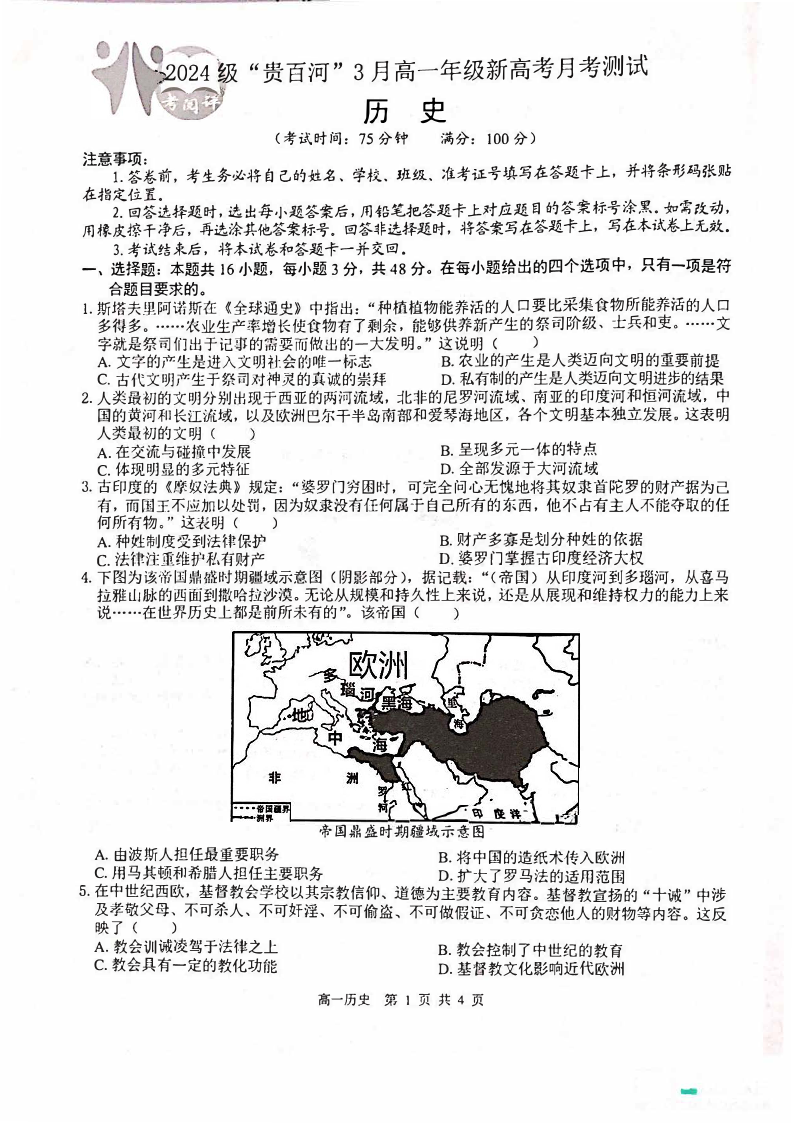 广西壮族自治区“贵百河”联考2024-2025学年下学期3月高一月考历史