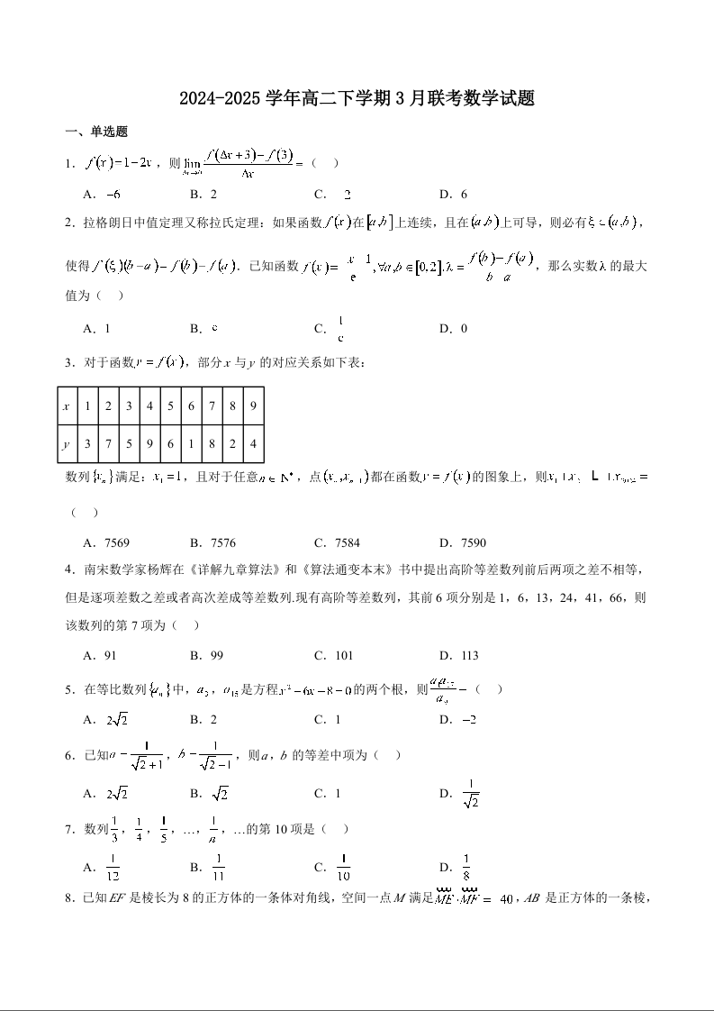 河南省驻马店市省级示范性高中2024-2025学年下学期3月高二联考数学+答案