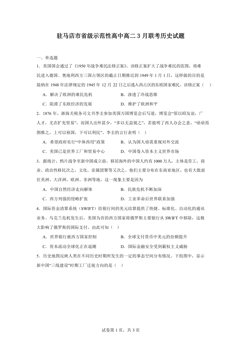河南省驻马店市省级示范性高中2024-2025学年下学期3月高二联考历史+答案