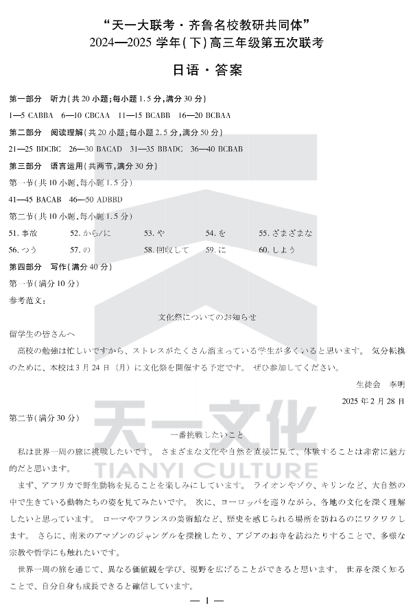山东省天一大联考齐鲁名校教研共同体2025届高三下学期第五次联考日语答案