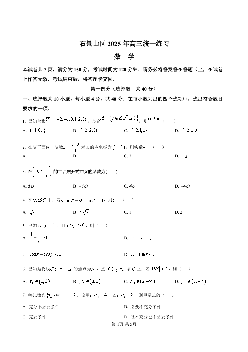 北京市石景山区2025届高三下学期一模考试数学 (原卷版)