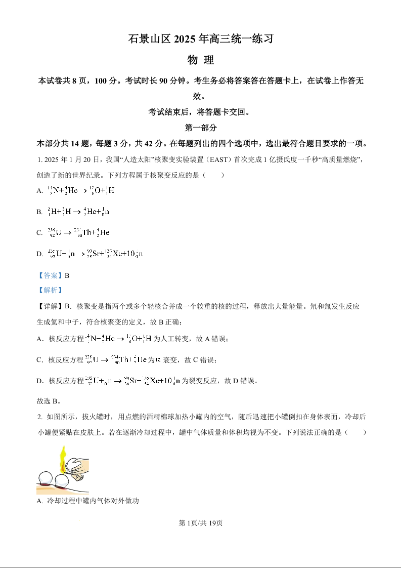 北京市石景山区2025届高三下学期一模考试物理(精品解析版)
