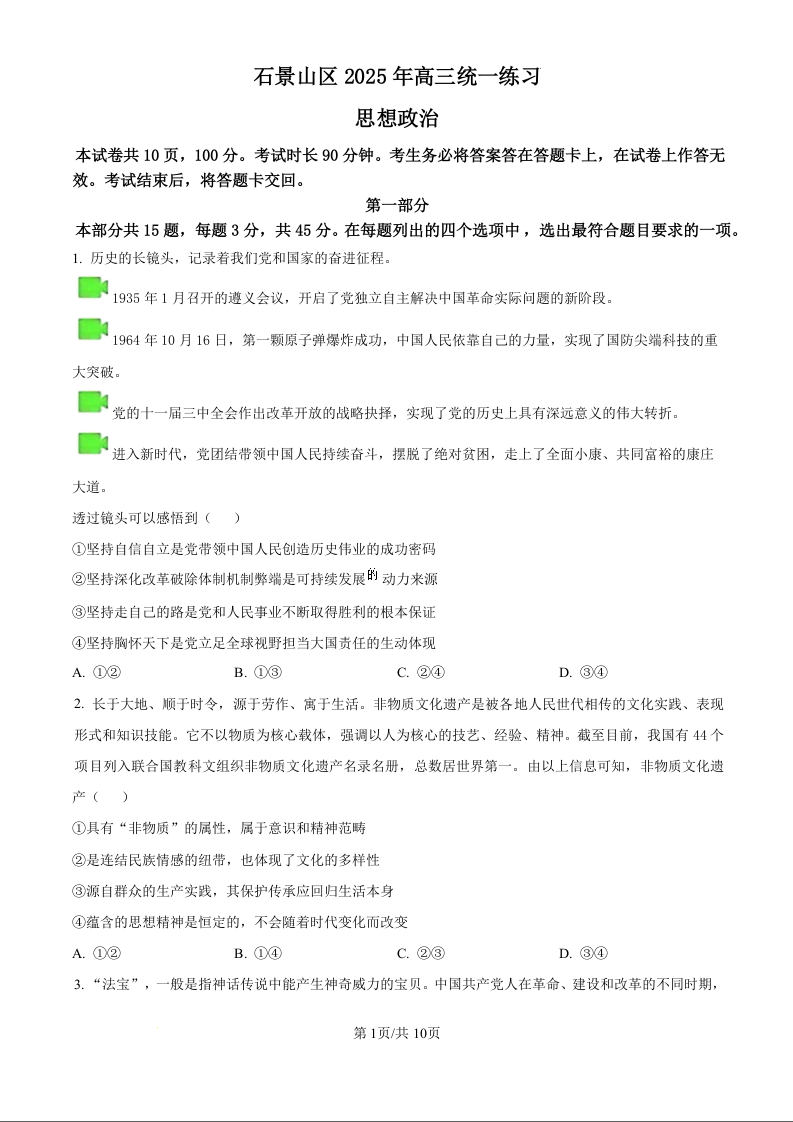 北京市石景山区2025届高三下学期一模考试政治(原卷版)