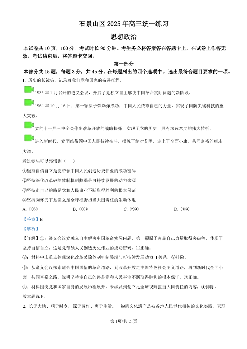北京市石景山区2025届高三下学期一模考试政治(精品解析版)
