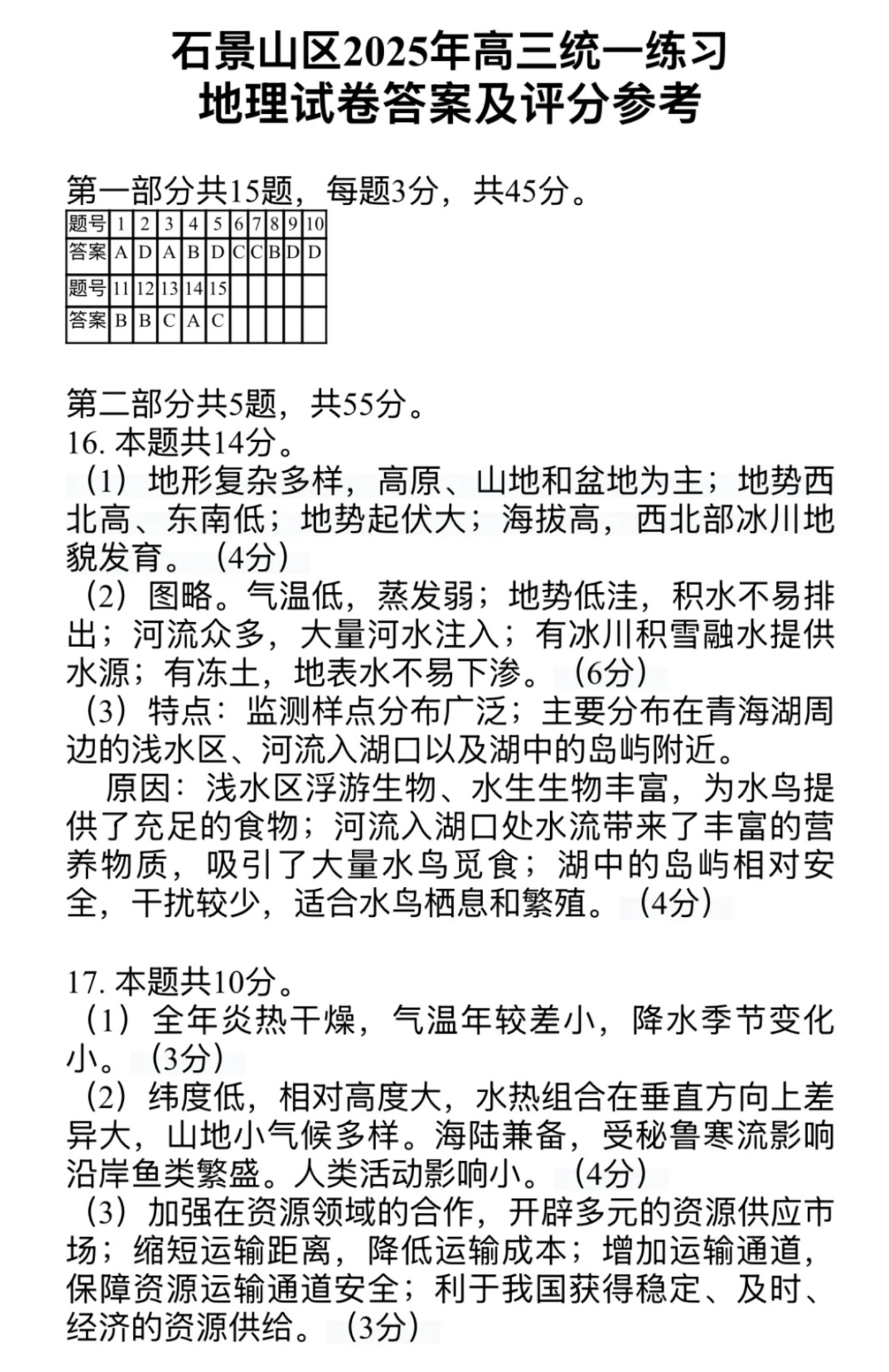 北京市石景山区2025届高三下学期一模考试地理答案