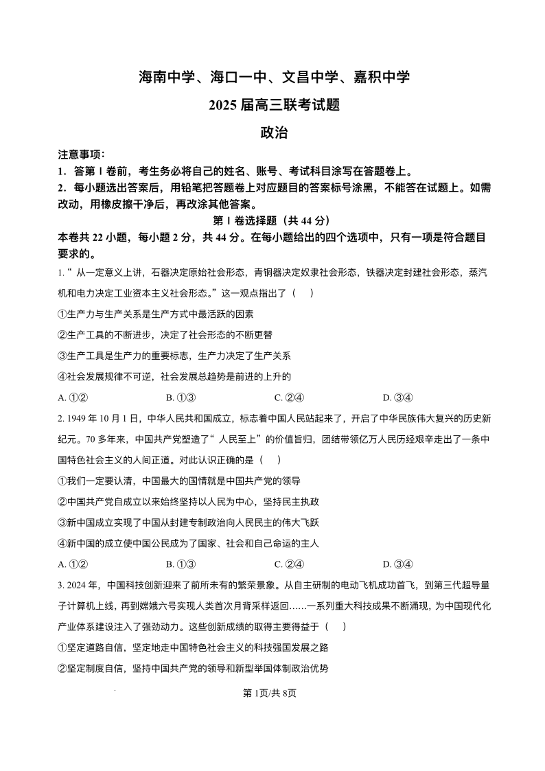 海南省海南中学、海口市第一中学、文昌中学、嘉积中学四校2025届高三下学期3月模拟联考政治答案