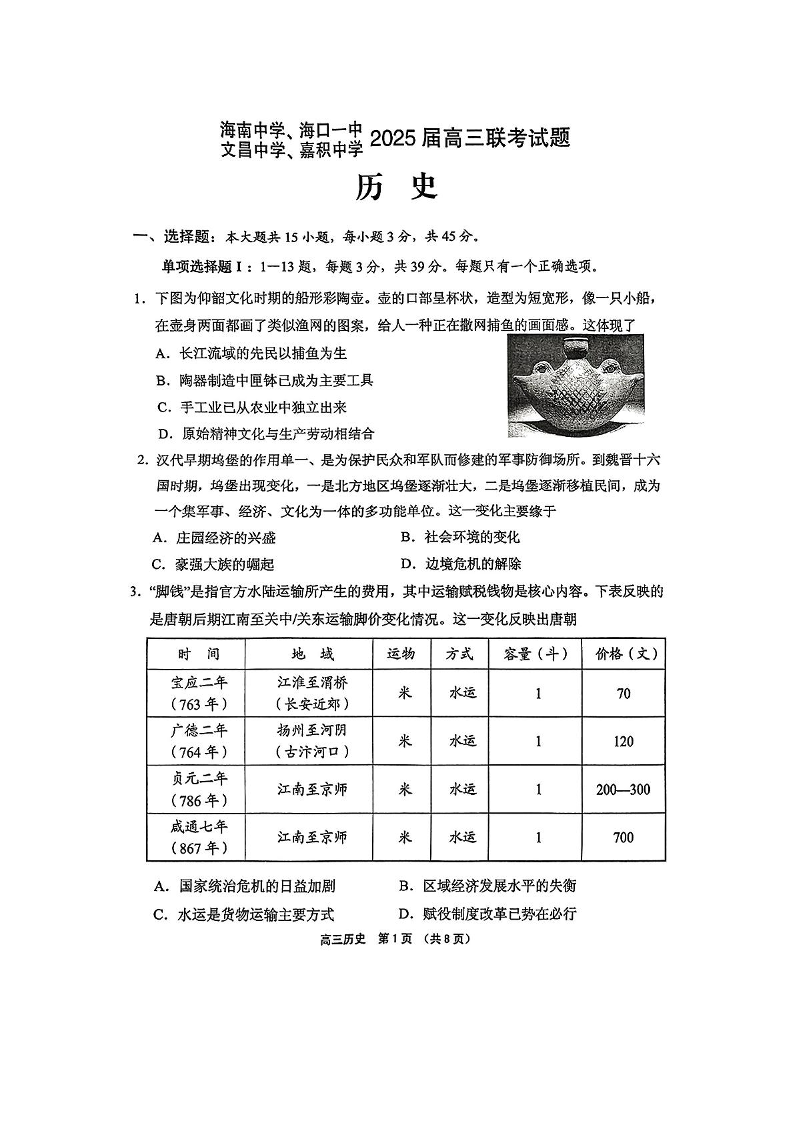 海南省海南中学、海口市第一中学、文昌中学、嘉积中学四校2025届高三下学期3月模拟联考历史+答案