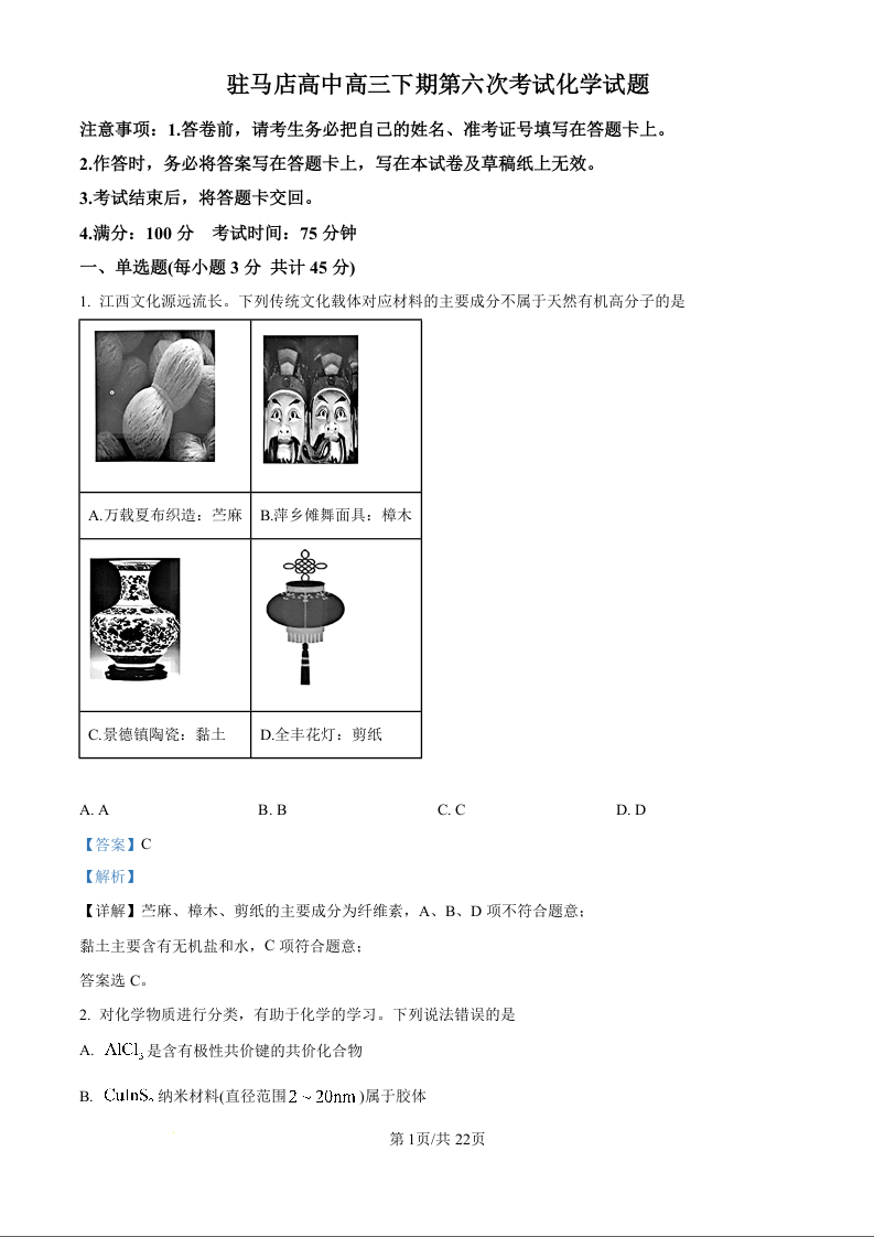 河南省驻马店高级中学2025届高三下学期4月月考化学(精品解析版)