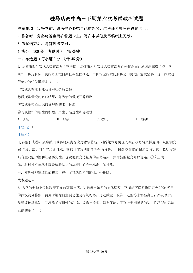 河南省驻马店高级中学2025届高三下学期4月月考政治(精品解析版)