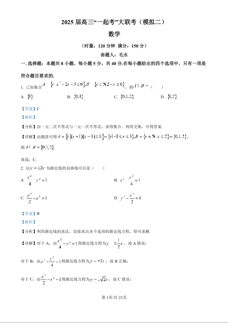 湖南省2025届高三下学期“一起考”大联考(模拟二)数学(精品解析版)