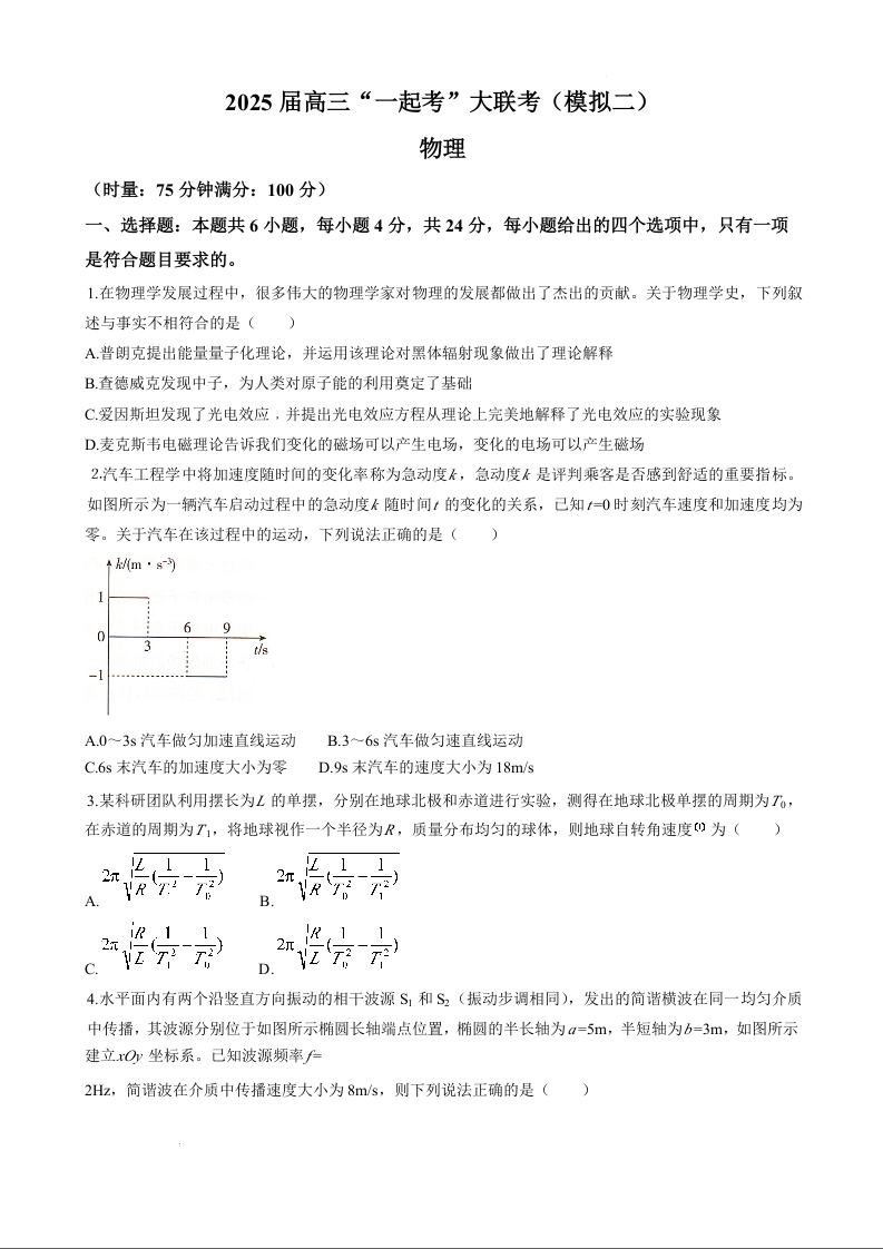 湖南省2025届高三下学期“一起考”大联考(模拟二)物理+答案