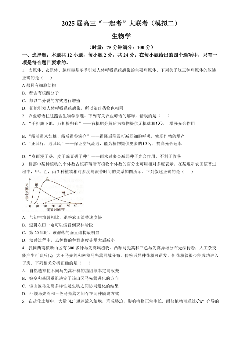 湖南省2025届高三下学期“一起考”大联考(模拟二)生物+答案