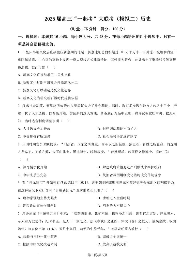 湖南省2025届高三下学期“一起考”大联考(模拟二)历史(原卷版)