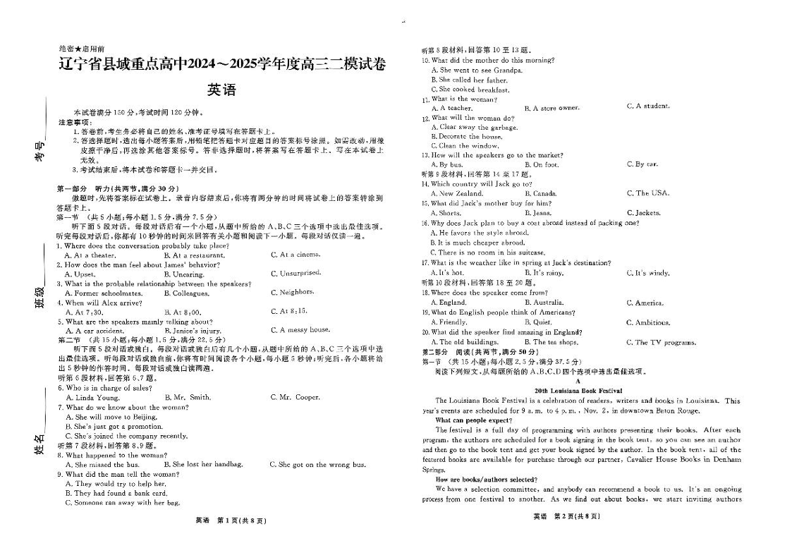 辽宁省县域重点高中2025届高三下学期二模考试英语+答案