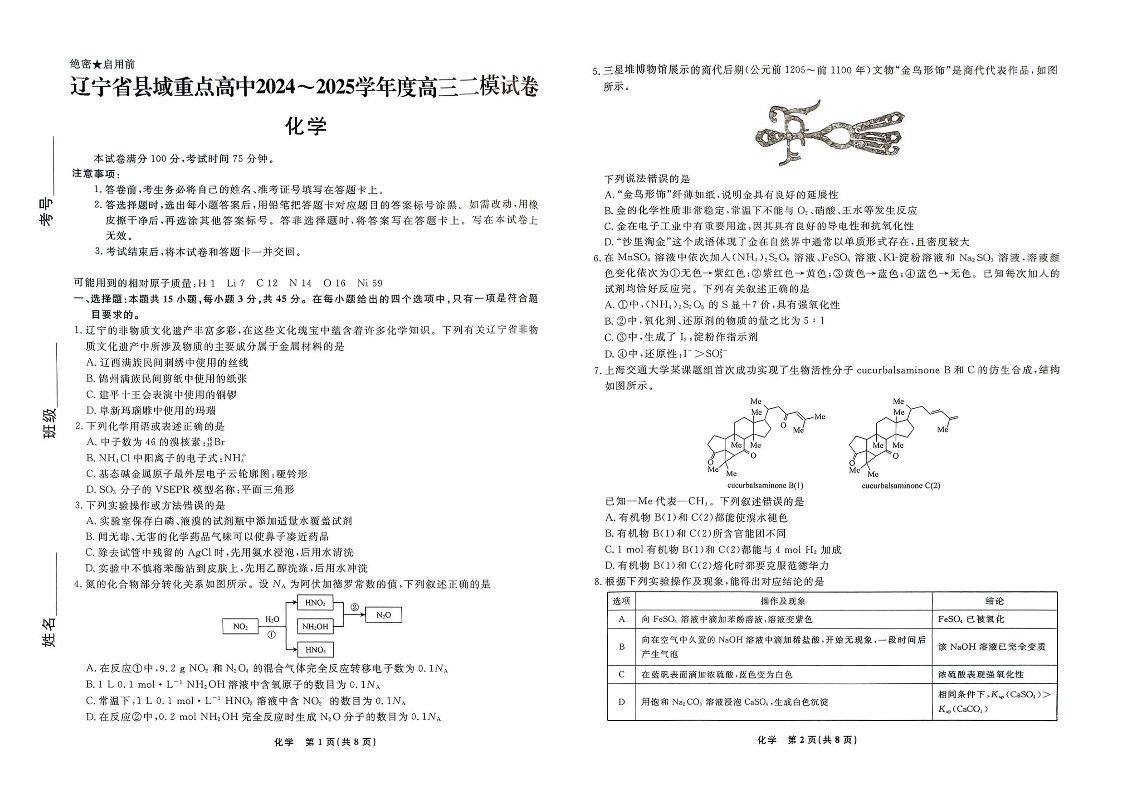 辽宁省县域重点高中2025届高三下学期二模考试化学