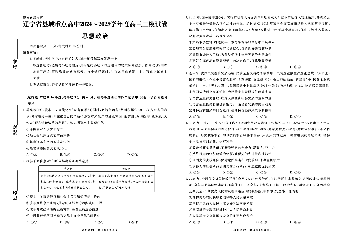 辽宁省县域重点高中2025届高三下学期二模考试政治+答案