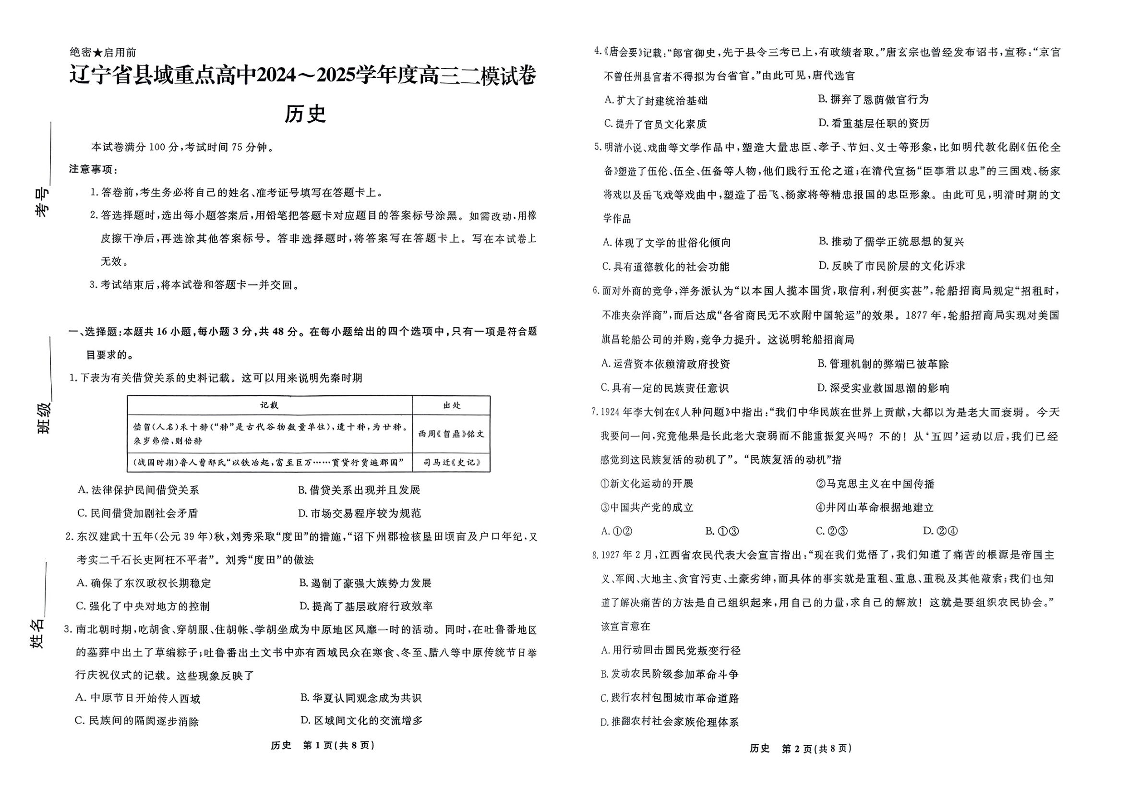 辽宁省县域重点高中2025届高三下学期二模考试历史