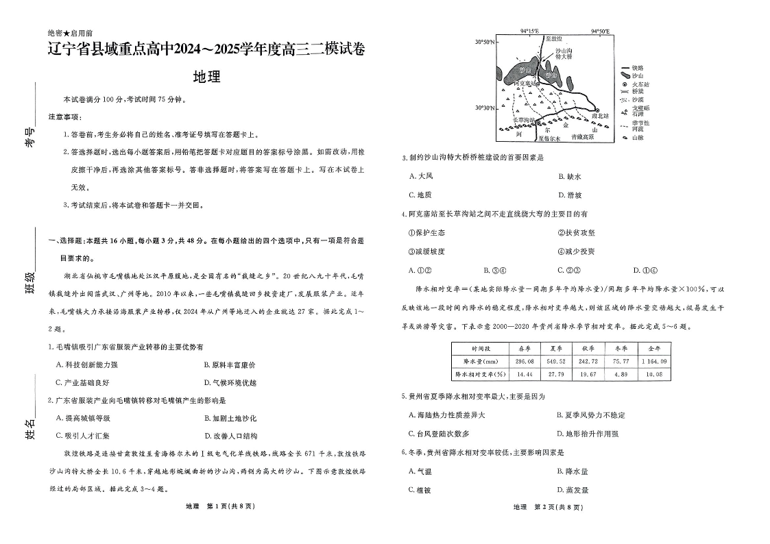 辽宁省县域重点高中2025届高三下学期二模考试地理
